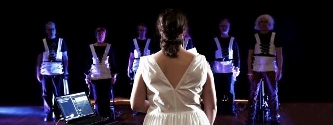 We aimed to augment Feldman’s ghostly voices, making them physical through an accompanying haptic score. We did this by first developing body-compliant sensing mechanisms such as stretchable worn sensors, and in-mouth implantable sensors, that can together capture the physiology behind the somatic experience of singing with the help of machine learning. To convey this experience to another person’s body, we used a soft haptic feedback mechanism integrated with the sensing system within a single fiber structure. Our integrated fiber-based soft robotic system allowed us to craft a programmable garment through fabric formation techniques, in which the wearer can experience another person’s voice through the wearer’s own body via micro- and meso movements in the robotic fabric patterns. We harnessed the intimacy of close-fitting sensing and actuating fabrics to extend the somatosensory perception of the body, making it possible to identify someone else’s singing body as one’s own.